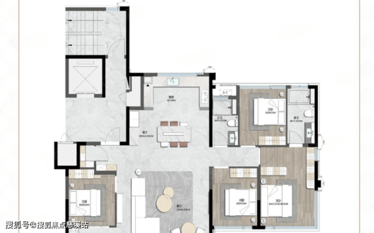 129平:四房两厅两卫,2T2,三开间朝南,不同于这几年主流的大面宽,这种四叶草,优势就是没有过道,不过动静不分离,加上餐厅没有独立空间,影响北面卧室的动线,加上公卫还对着餐厅,主要亮点就是主卧也做了L型的大玻璃。