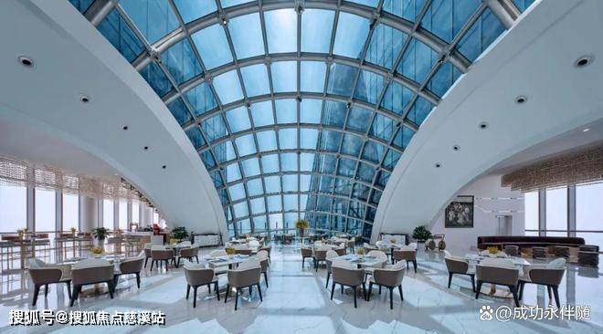 巧妙地将海洋元素转化为设计语言,形成了与大海相呼应的优雅柔和又充满张力的建筑形态。起伏的海浪通过裙楼蜿蜒的墙体得以表达,柔和的涟漪在幕墙上展现出来,错落有致的玻璃幕墙就像是被阳光照耀下的海浪,与塔身的曲线和塔冠的穹顶一起形成了垂直景观,宛如大浪、小浪和千层浪。波光闪烁,碧波万顷,这是阳光下玻璃折射的诗意效果。海天中心是一个集多种功能于一体的大型综合体。项目包括两个五星级酒店(其中海天酒店拥有青岛最大的会议厅,面积达2600平米),5A级写字楼、豪华公寓楼和一个五层的商业中心。