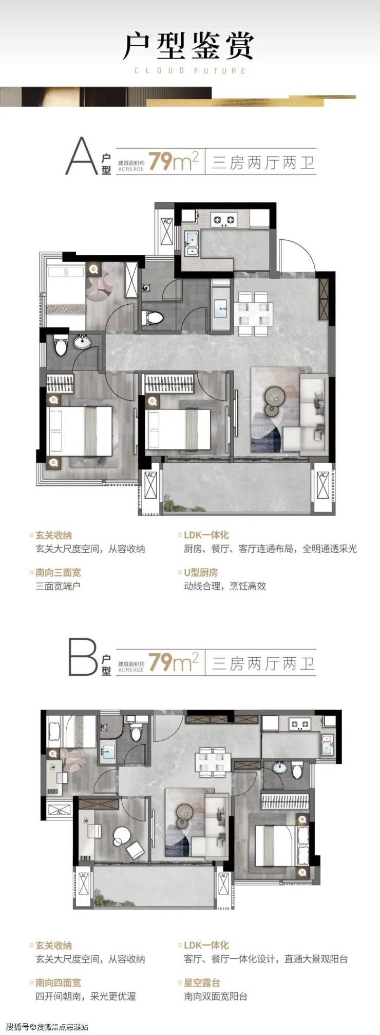 79㎡三房两厅一卫: 极致紧凑功能性,南向双卧,总价门槛低,适合年轻家庭或预算有限购房者。