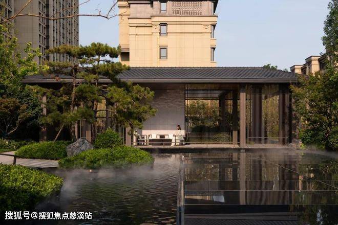 禧瑞府迎宾门庭,将古代屋面瓦及歇山檐运用其中,立面线条纤细轻盈,以现代材料铝合金线性构建表达线条感,镜水搭配主景大树与三个置石与建筑浑然天成,重现四水归堂文化礼仪。