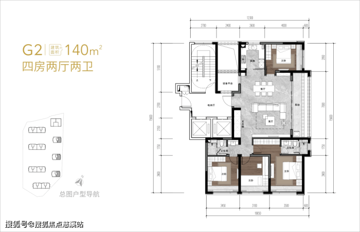 建面约140㎡户型,是四房两厅两卫,因为该户型所处楼栋只有一个单元,所以做到了270°三面采光的格局,很通透;这个户型是当下流行的大横厅设计,尺度达到了7米宽,面积约53㎡,很奢阔。
