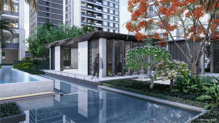 吉祥6号中庭处,配置了一个无边界游泳池,可以让业主在自家社区就能享受到酒店式的度假体验。