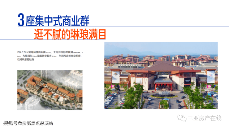 3座集中式商业群 —— 滨海风情商业街距项目约1km、约8km到达九里润街、约8km到达王府井悦舞小镇(原首创奥特莱斯购物中心)