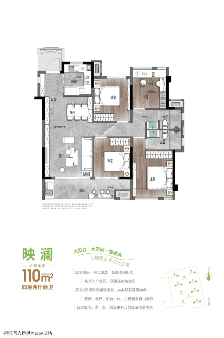 约110㎡的大四房户型,则采用了内外双玄关空间设计,配备6.8米超大宽幕阳台和落地玻璃窗,确保室内采光充足,视野通透。而约130㎡的四房户型,则特别考虑了高阶客群的居住私密感,采用了双主卧套房设计,得房率高达94%,并配置了独立家政空间,让居家功能更加完善。