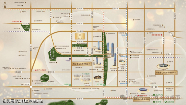 CBD正核心: 项目坐落于济南规划中的3.2平方公里中央商务区正核心,是区域内唯一在售的新建住宅项目,占据城市发展的最高地。