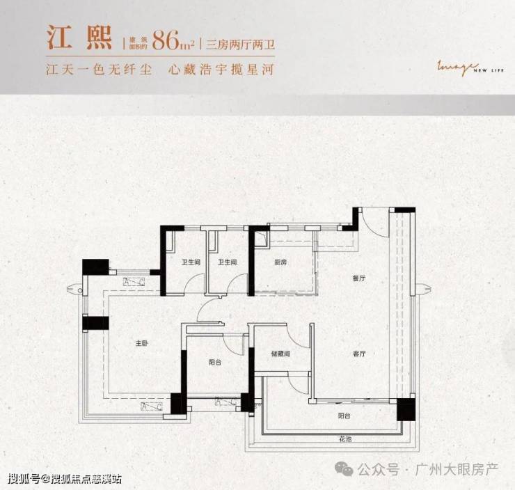 建面约86㎡:三房两厅两卫设计,南向观景大阳台,全屋动静分离,主卧带270°飘窗