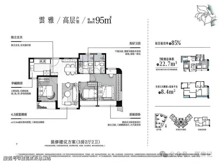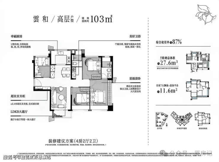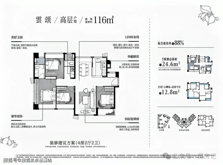 •总户数:536户,楼栋采用洋房+高层错落式布局,含5栋11层洋房和4栋25 - 29层高层;洋房为1梯2户层高3.15米设计,高层为2梯4户的户户类边套设计;楼栋最大楼间距约81米;规划车位数502个,车位配比1:0.9;