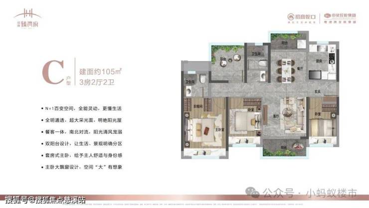 105㎡3+1房:南北双阳台设计,南向6米景观阳台,主卧套房带独立衣帽间,改善升级首选。