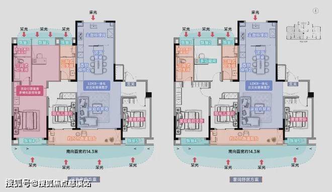 该户型能够充分满足(1+2+3+4)家庭成员结构成长性变化,可以照顾到不同时期的家庭生活场景。对比市面上大多户型的一成不变,这才是改善客群真正所需的更有差异化、更有价值的户型。