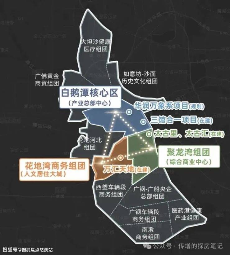此外花地湾片区基本都是由万科统一开发,汇合白鹅潭-花地湾-聚龙组团的板块张力,白鹅潭核心区、聚龙组团、花地湾组团,于半径约2KM内构建珠江西岸CAZ黄金三极。