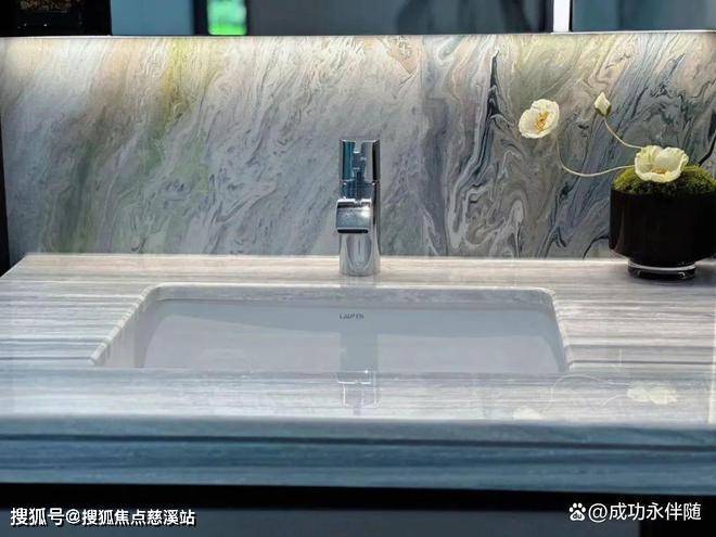 浴室岩板为碧海珈蓝岩板密拼,独特的青调蓝纹,并以海上浪花为原型做了优化,表面纹路有凹凸质感,好像一幅油画,体现主人高级品味。