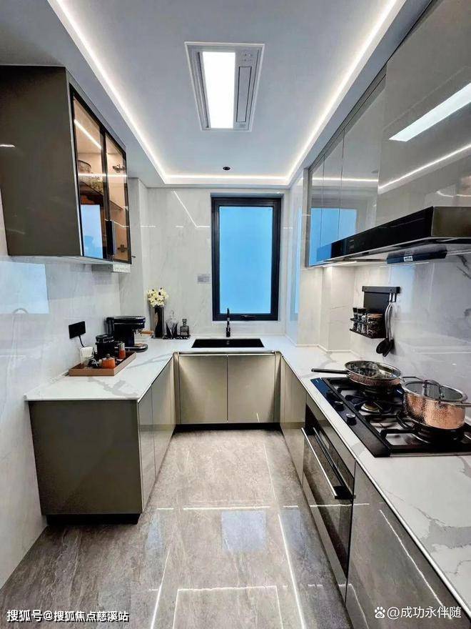 缦云的灯光设计很牛,厨房不仅在油烟机吊柜下方,做了感应照明。还沿着橱柜滴水线,设计了一圈氛围灯带,为各位厨神们,营造出了极高品质的氛围感。