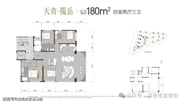 约180㎡四室两厅三卫:私享入户电梯前厅;约270°转角环厅+约7.7米开敞阳台设计,约16.3米超大南向四面宽,巨幅落地窗;入户设备平台,约5.5米面宽主卧,双开门+步入式衣帽间;约5.5米面宽豪华北套卧。