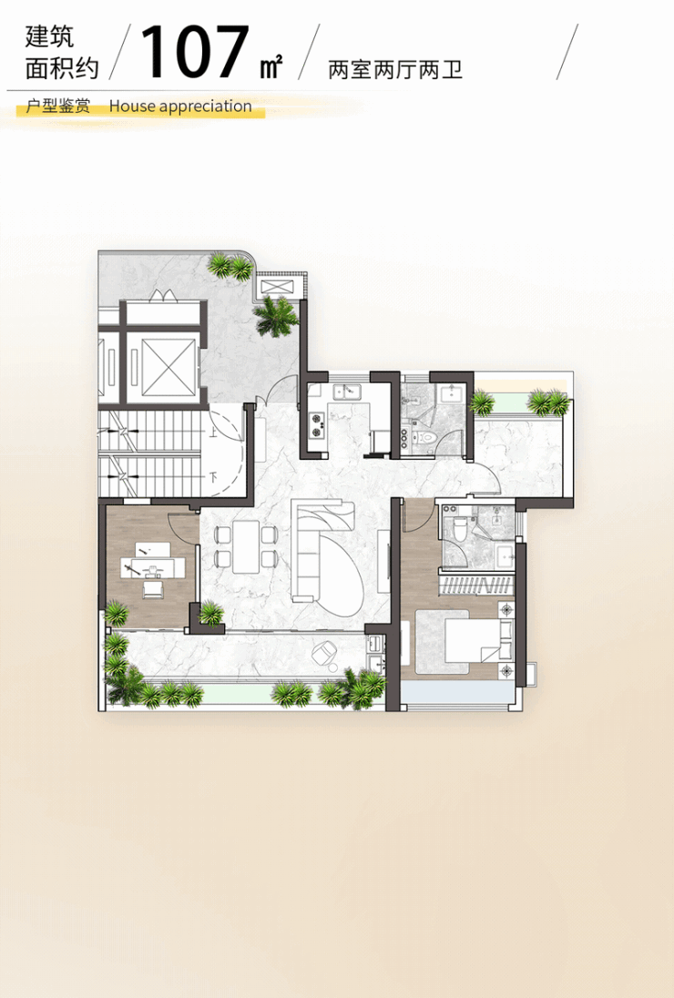 其次,在产品设计上,鹿城壹号也拿出了十足的诚意:「闻馨」组团全部采用纯板楼设计,并且标配了一梯一户布局。整个组团仅规划两种户型,分别是建面约107㎡和126㎡。