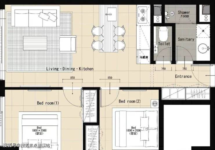 B户型 建筑面积70-75㎡ 2房2厅1厨1卫