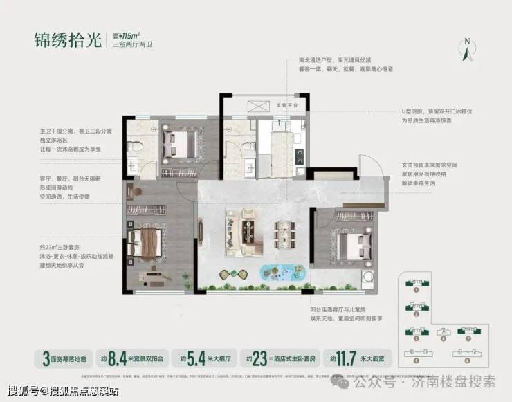 【115㎡三室两厅两卫】:分布在1/2/3/7号楼的边户。约11.7米大面宽,约8.4米宽景双阳台,约5.4米大横厅,3面落地窗,约23㎡主卧套房。