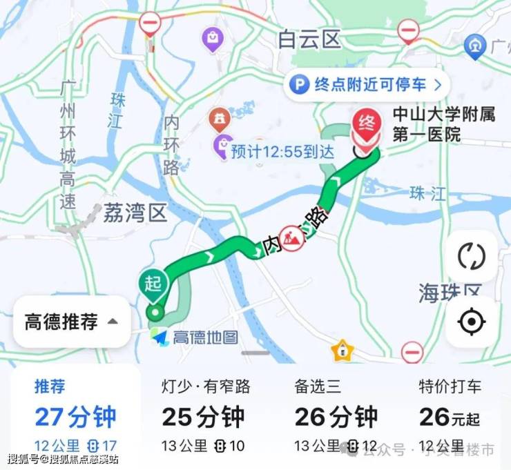 自驾去中山医:东漖北路转花蕾路至洲头咀隧道,再转内环路到东华南路,全程12公里,耗时27分钟左右。