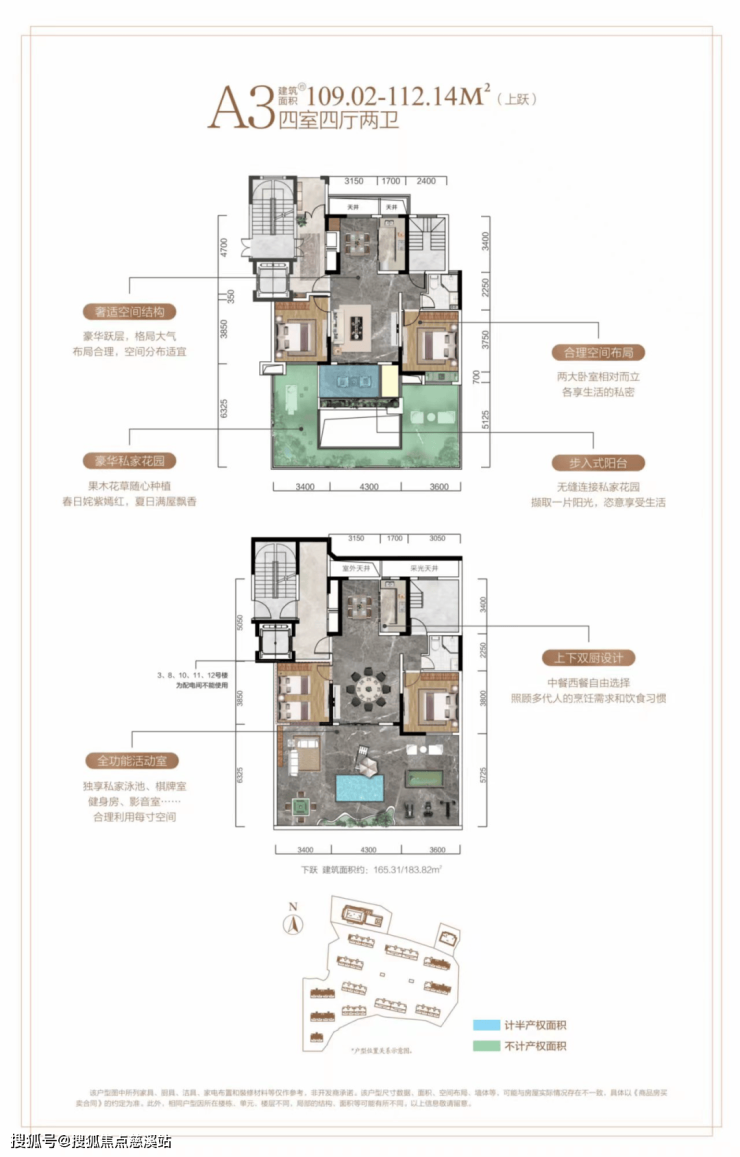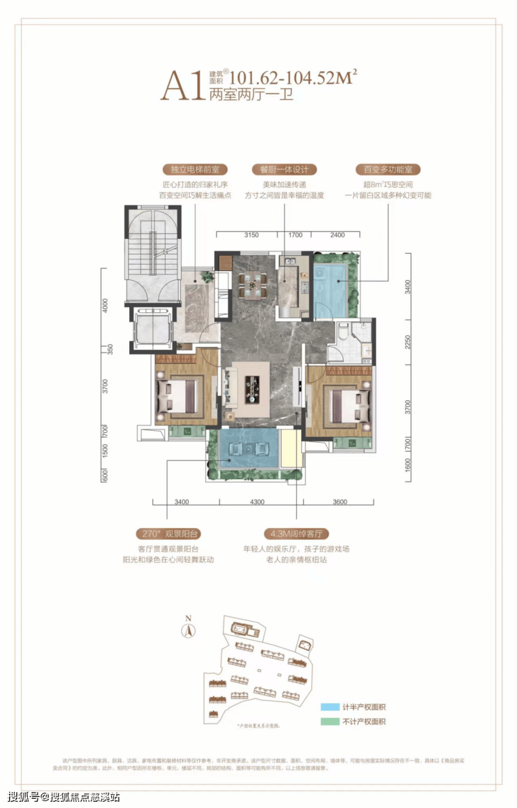 户型亮点:电梯入户送入户花园,得房率高达97%,客厅4.3米大开间,宽2.8米大阳台,阳台面积可达约14㎡,层高3.1米,南北通透通风好,次卧与主卧分隔开私密性好,明厨明卫