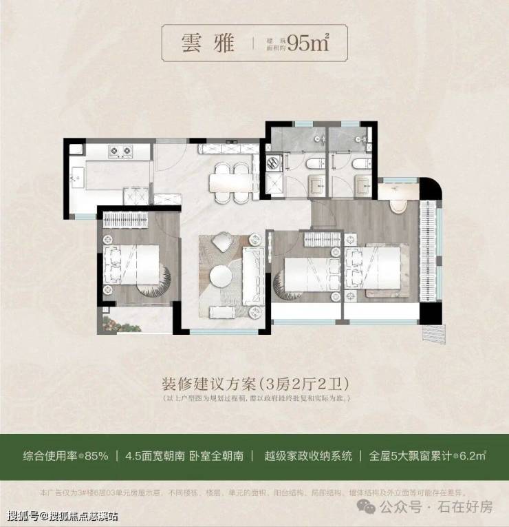 主推的建面约95㎡越级三房,以85%的综合使用率打破空间桎梏——相当于市面110㎡的实际体验感,让“三代同堂”从拥挤将就变为舒适从容。约13.3米奢阔面宽 + 4.5开间朝南,让阳光成为生活的日常访客,三间卧室皆能时刻被阳光拥抱,长辈房更实现“动静分离”,还附赠南向阳台,为长辈打造专属的休闲天地。