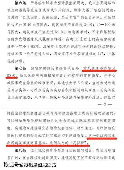 总则第二项第七条明文规定:住宅建筑除历史遗留项目外,建筑高度不得超过80米;同一街坊内禁止出现建筑高度高差悬殊、比例失态的“高低配"。