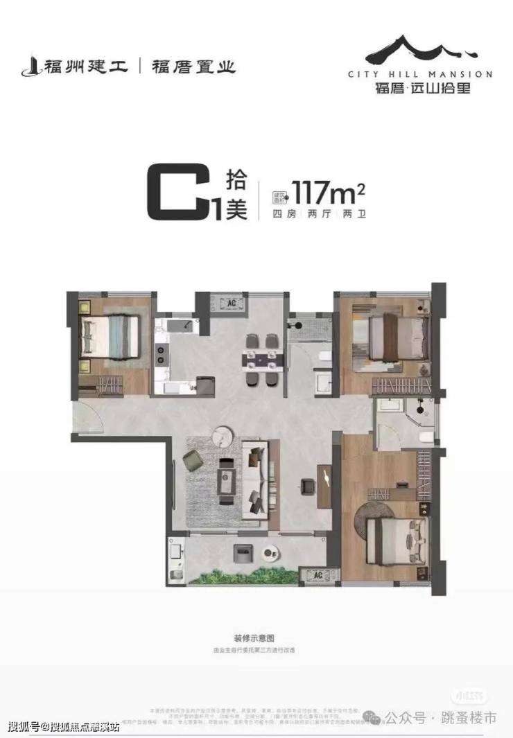 117平:端头3.5房,南北通透,户型开间大,但是不够方正