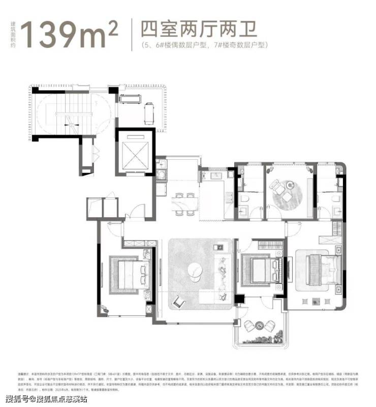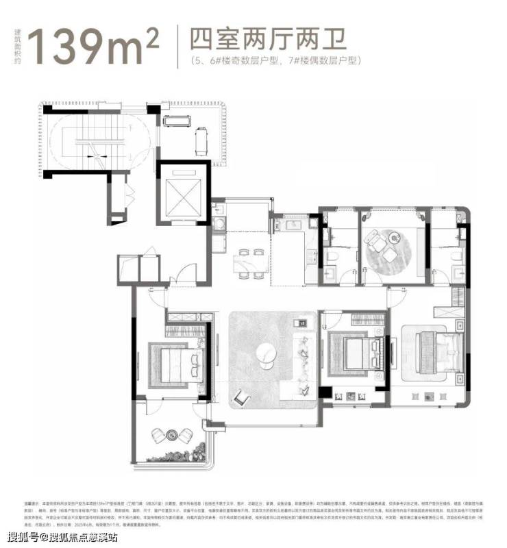 建面约139㎡四室两厅两卫户型