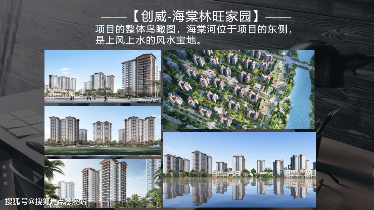 项目的整体鸟瞰图,海棠河位于项目的东侧,是上风上水的风水宝地。
