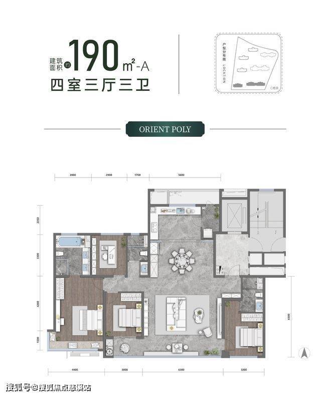 约190㎡产品,在项目中仅规划两栋楼,全部位于地块南侧。这样的排布,让项目北地块有着围合布局,洋房位于地块内侧更为私密,而景观楼王的头牌视野也得到了最大化的体现。