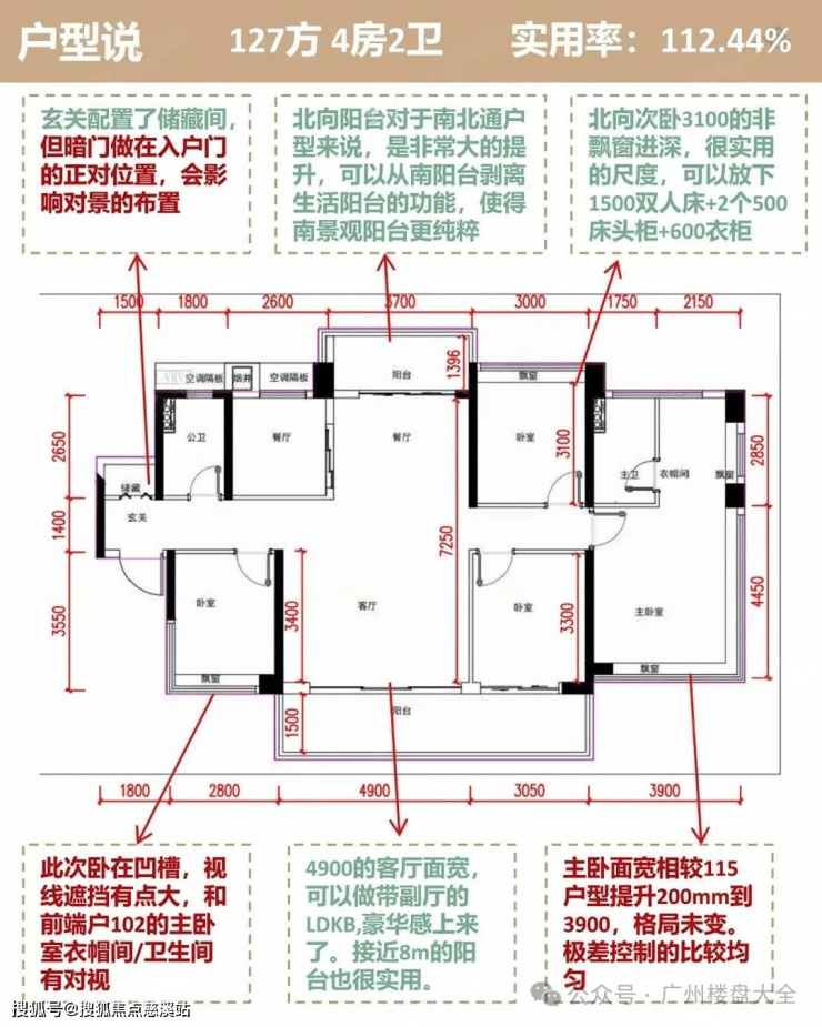 115㎡四房两厅两卫:南北对流,带入户玄关,低层北向朝客运站,高层朝马路,噪音问题需留意。