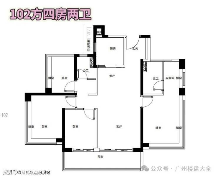 102㎡四房两厅两卫:南向户型,可看花园,高层可部分观赏河景,但需注意部分房源门对门设计。