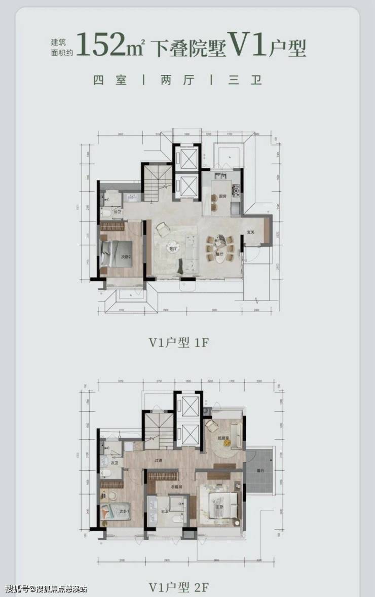 下叠院墅 V1 户型,约 152㎡(或 151.4㎡ ),四室两厅三卫。配备私人电梯、双重玄关入户,从地下车库可直达。约 6.7 米奢阔度假横厅,约 40㎡会客空间 。还有私家花园露台,主卧是酒店行政套房式设计,还有多重可拓展空间。