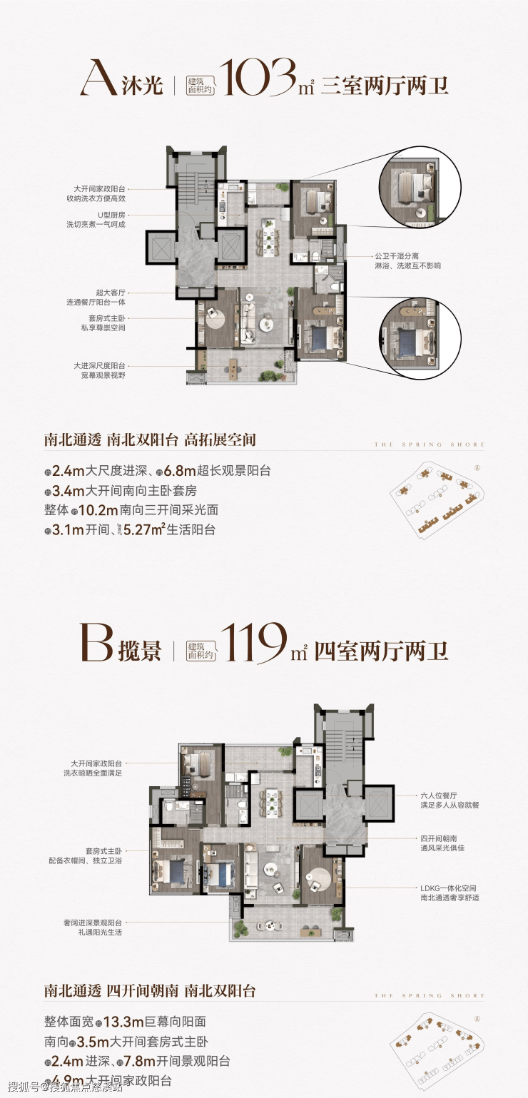 楼栋与户型:规划9栋住宅,共684套,主力户型为103-143㎡的三房至四房,层高最高约3.05m,南北通透,双阳台设计,得房率超110%。