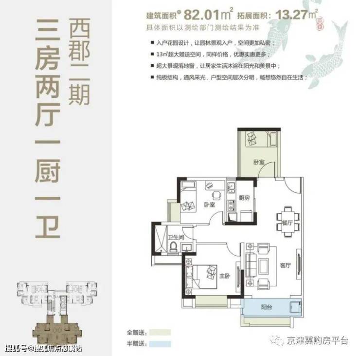 82㎡(3房2厅1厨1卫),赠送13㎡;