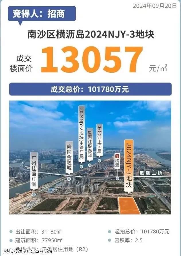 该项目位于广州市南沙区横沥岛凤凰大道西侧、横沥中路北侧的2024NJY-3地块,2024年9月20号由招商蛇口以底价101780万元获得,折合楼面价13057元/平方米。