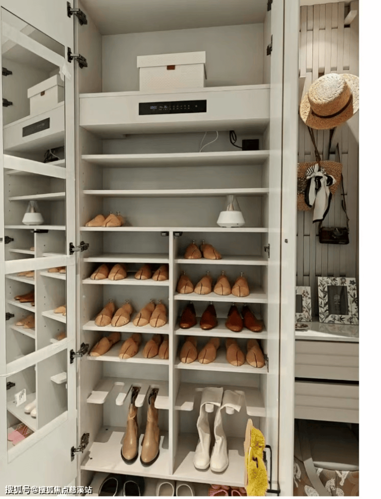 钥匙放在下方的台面上,顺势将手机充电。右侧打造了鞋柜,配备鞋柜精灵,并且将所有格子都给你做好,建面约132㎡户型甚至能放下整整三四十双鞋子!