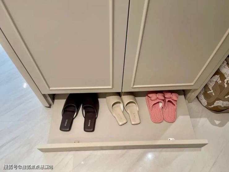 鞋柜下方,还有个勾脚抽放着拖鞋,旁边是换鞋凳等空间。能想到、想不到的都替你做了……