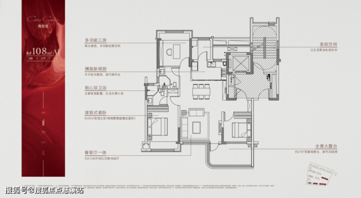 而且,市面上也很少见到建面约108㎡的小户型,能带有家政间和露台,还能同步实现市面上建面约130㎡以内很难做到的大客厅、大露台、大卧室、大厨房。