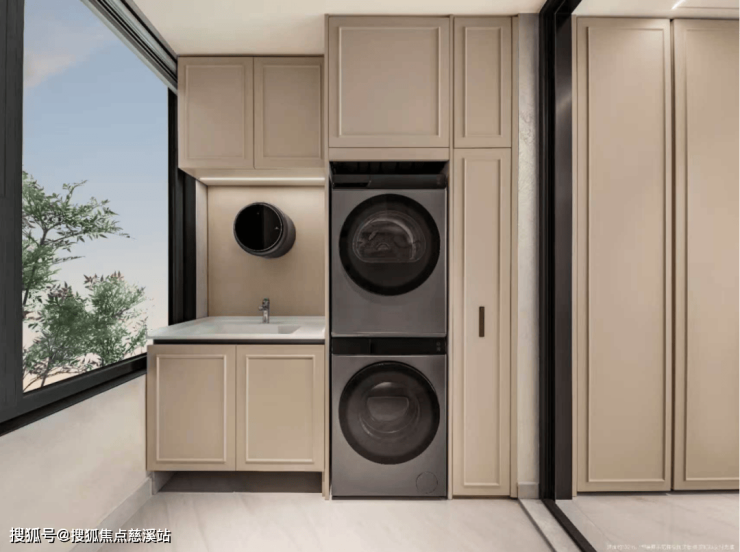 而北阳台就用来做家政间,预留了洗衣机、烘干机、扫地机器人、吸尘器等这类占地方的超大件的位置,家务器具从此有了专属收纳的地方。