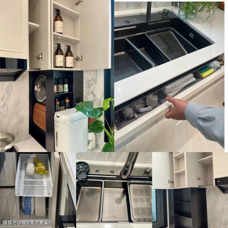 此外,还做了洞洞板和小拉篮,大台盆分区,装了洗杯器和洗泡池……角落里很鸡肋的空间,转化成高频收纳,从“装得下”到“装得好”,为业主建立居家收纳秩序。