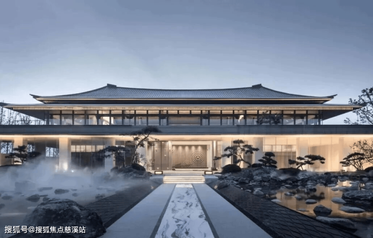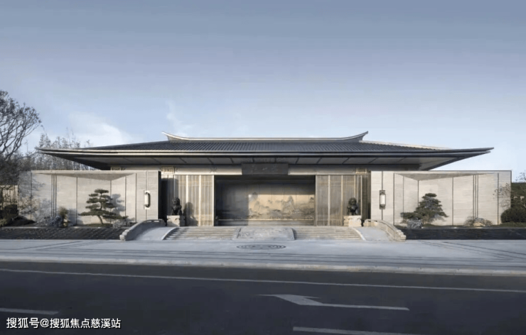 本项目展示区大门运用现代的设计手法结合中国古建筑基本元素,提升大门的质感的同时给予人皇家般的感受。简约稳重的设计造型给予人安心高贵的极致体验。大部分材料均用暗红色拉丝不锈钢平直的钢板更为建筑提供的浑厚高贵的品质。