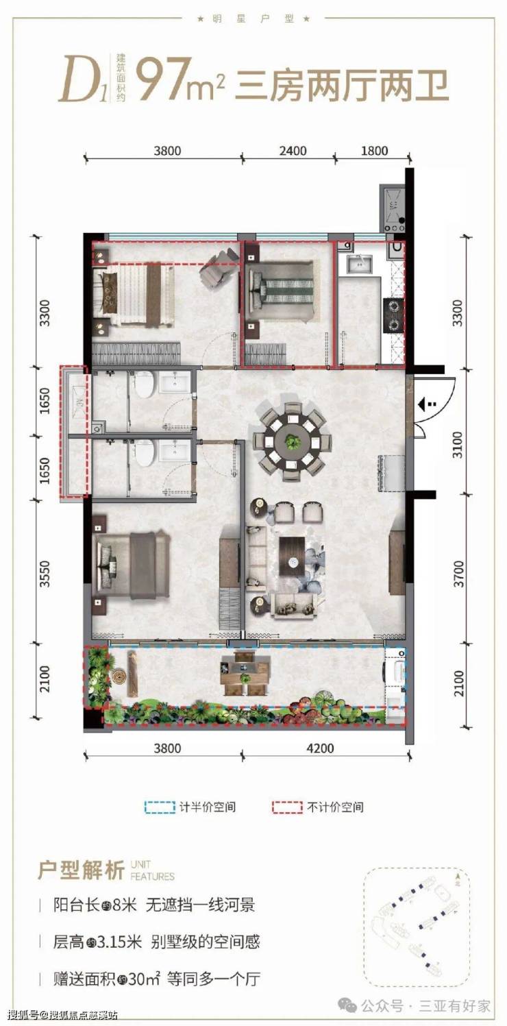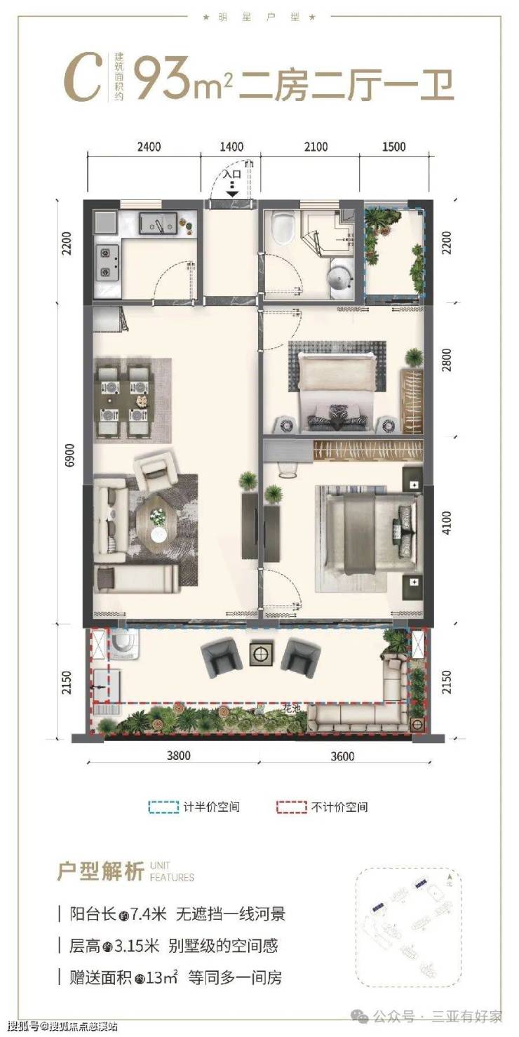 ②产权式酒店,户型南北通透,面积93-145㎡两房至四房。赠送超大面积,93㎡两房一卫、97㎡小三房两卫、115㎡三房两卫、141㎡四房三卫;阳台面宽高达12米,部分阳台可270°三面河景。