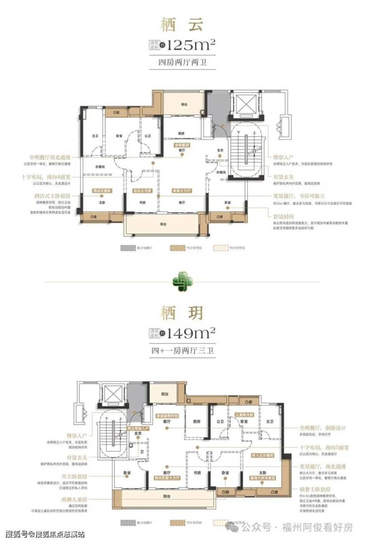 一梯两户双开门,类独立电梯厅;南向四开间,餐客一体约 38.8㎡方厅;全明通透,得房率高,适合刚改 / 二孩家庭。
