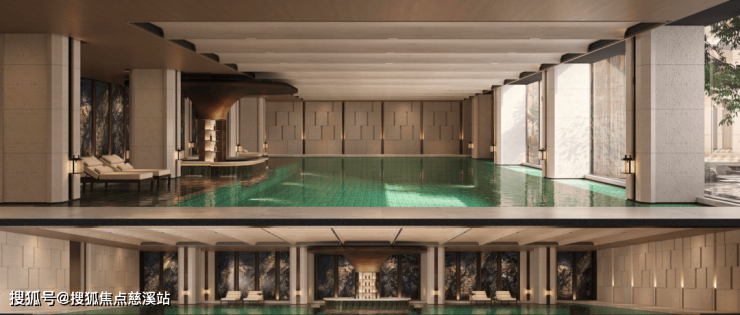 7)「TOP级泳池」南京首创无界浮岛吧台,目前南京唯一具备有水上吧台的室内恒温泳池——四泳道恒温泳池与庭院光影交融,采用无边界景观手法,通过上流的瀑布水景,创造“无边际泳池”既视感。