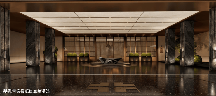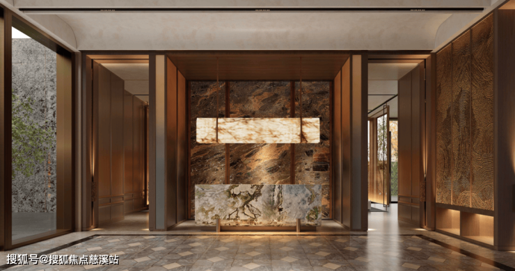 两侧立柱及酒店式环岛落客厅大面均使用“爱马仕灰“大理石弧形水刀切割,对景景墙采用百万级蓝翡翠奢石,穹顶下方采用安哥拉黑液态大理石,工艺难度高,奢化感拉满。