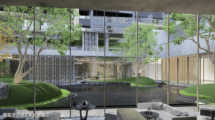 8)「TOP级庭院」约1000方下沉式庭院,叠水游园手法+3D立体设计,营造⻜瀑悬流、林下空间等高级松弛感。