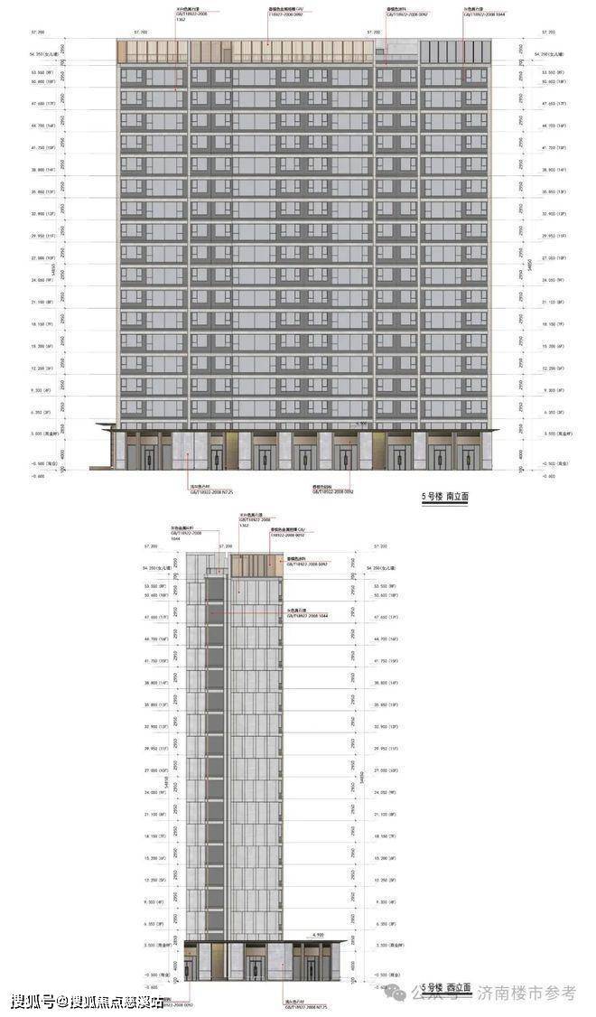 外立面一层是香槟色铝板+浅灰色石材;标准层是灰色、米白色真石漆和香槟色涂料;顶层有香槟色金属格栅造型。