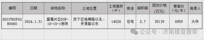 2024年1月31日,大华摘得,总价35139万元,楼面价8959元/平。