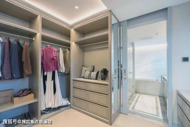 行政套房主卧设计,五星级标准打造寝居、衣帽、卫浴三大空间。主卫采用大浴缸+双台盆设计,精选德国高仪、TOTO高端品牌。全屋奢石铺装,源自土耳其的“芬迪蓝”、白金沙天然石材、蓝金灰石材。