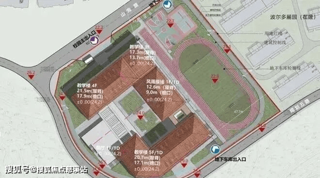 目总用地面积约20113.5㎡,总建筑面积27954.7㎡,容积率0.8,建筑密度30%,绿地率12%,地下车位200个。项目建设内容包括三栋教学楼,分别是3层、4层、5层,一层风雨操场,一层餐厅,东侧为室外操场,校园主出入口位于北侧山海路,规划为18班小学。