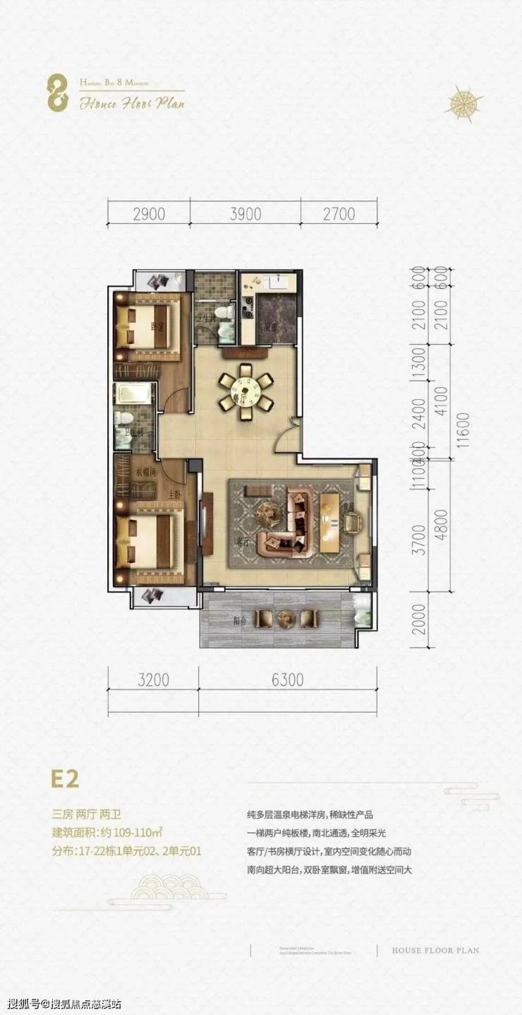 一单元两梯4户,二单元2梯3户,13层高,三房两厅两卫,超大2.4-2.75m阳台开间,双户型全朝南设计。